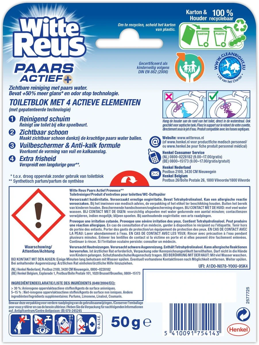 Ontdek Witte Reus Paars Actief Provence voor een hygiënisch schoon en glanzend toilet. Dit toiletblok zorgt ervoor dat je toilet makkelijk schoon en fris te houden is van de eerste tot aan de laatste spoelbeurt.